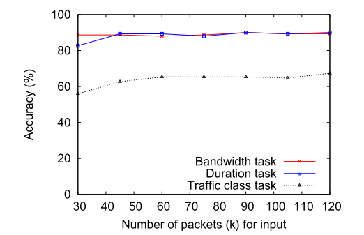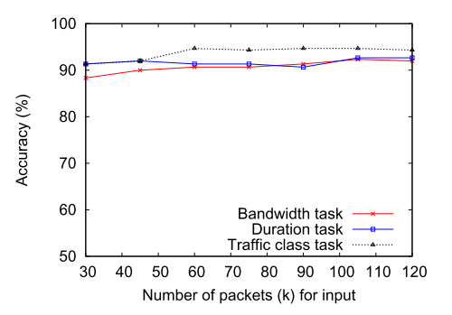 图5示出了当使用不同数量的包作为输入时,所有三个任务的多任务学习方法的准确性。有趣的是,带宽和持续时间可以用30个包来预测,而增加包的数量并不能显著提高准确性。对于流量分类任务,从30个数据包到60个数据包有显著的性能改进。然而,通过观察更多的数据包,流量分类预测并不能得到更准确的结果。