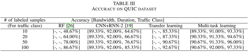 在这一部分中,我们比较了我们的多任务学习方法与迁移学习和单任务学习方法的准确性。表3显示了QUIC数据集所有方法的准确性。对于单任务学习方法,我们使用了两个成功的模型,即具有统计特征的随机森林(RF)[26]和在[19]中提出的CNN+RNN模型。我们从零开始为每项任务训练模型三次。对于带宽和持续时间预测,我们使用整个数据集进行训练,因为它不需要人工标注。这就是为什么当表3中的标记样本增加时,准确度保持不变。注意[26]中的RF方法以整个流的统计特征作为输入。由于带宽和持续时间是统计特征,因此如果整个流是可访问的,则可以获得它们。因此,如果分类器能够观察整个流,就不需要预测带宽和持续时间。这就是我们不在这两个任务上训练射频模型的原因。对于迁移学习,我们采用了类似于[21]的方法,其源任务略有不同。我们首先用整个数据集训练模型以预测带宽/持续时间元组。注意,对于这个任务,我们使用整个训练集的两个标签。在对模型进行训练之后,我们移除最后一层并用一个新层替换它并初始化权重,类似于[21]。然后,对模型进行重新训练,完成流量流类别预测任务。最后一个模型只预测流量类别。这就是为什么表3没有包含迁移学习方法的带宽和持续时间精度的原因。注意,我们使用的迁移学习方法和[21]中提出的方法之间还有另一个区别。在[21]中,该模型以采样的时间序列特征作为输入,不适合用于资源分配、路由或QoS所需的在线分类。因此,我们将前k个包作为模型的输入,而不进行采样。对于多任务学习方法,我们使用所有的训练数据训练整个模型。我们使用整个训练数据样本的带宽和持续时间标签,而我们只为流量类任务提供有限数量的标签(在第一列中指定)。在这个实验中,我们将 λ \lambda λ设为1,以同样地强调所有三个任务。此外,我们使用前60个包作为输入(k=60)。