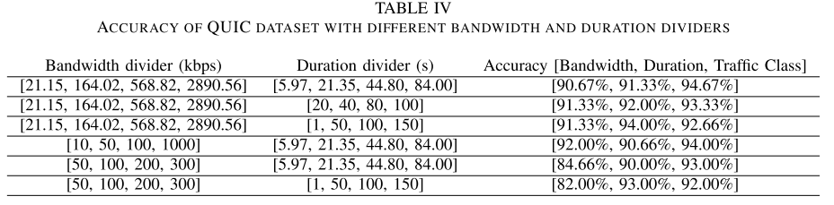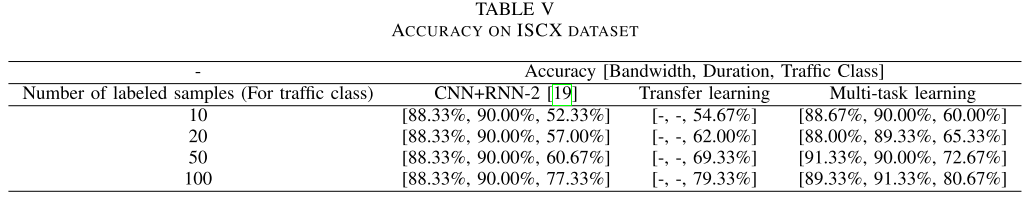 表5显示了ISCX数据集的带宽、持续时间和流量类任务的准确性。无论采用何种学习方法,ISCX数据集(表5)中的流量类任务的准确性都低于QUIC数据集(表3)。类似于V-B部分,我们将