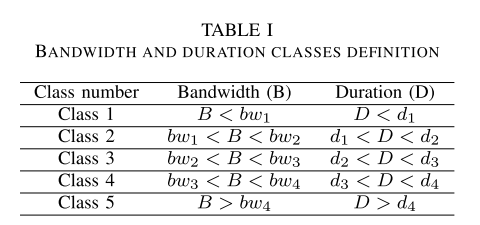 带宽和持续时间类定义的标签如表1所示。我们将带宽和持续时间值分为五个类。我们称之为
