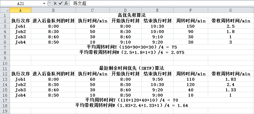 (2)计算每种情况下作业的平均周转时间和平均带权周转时间。