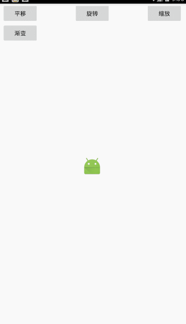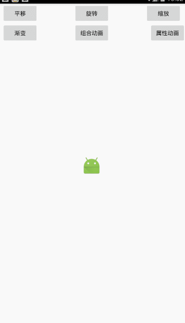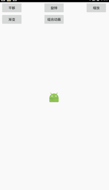 补间动画分为四类:平移动画,旋转动画,缩放动画和渐变动画。这几类动画用法都差不多,只是对象参数不同这里我统一展示出来。以下是效果图: