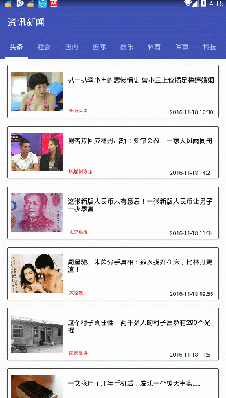 上图那个小Demo,运行起来是十分的流畅。在图片加载方面,我所使用的是Android中的LruCache。一种内存缓存策略,你能看到,其实加载速度是非常的快,非常的流畅的。附上代码: