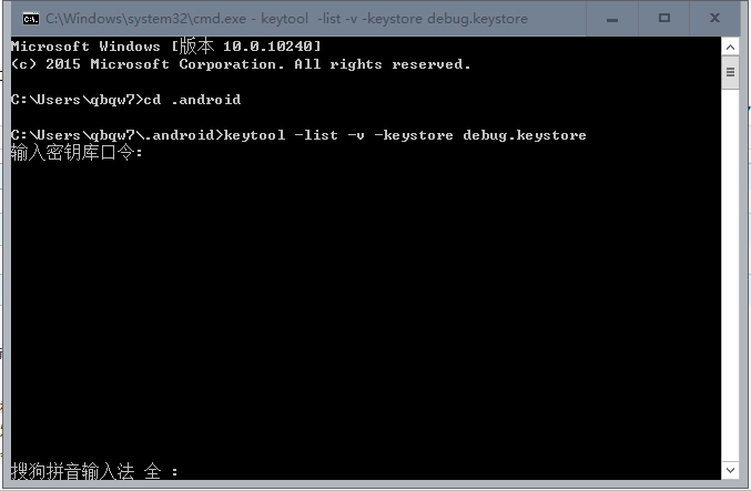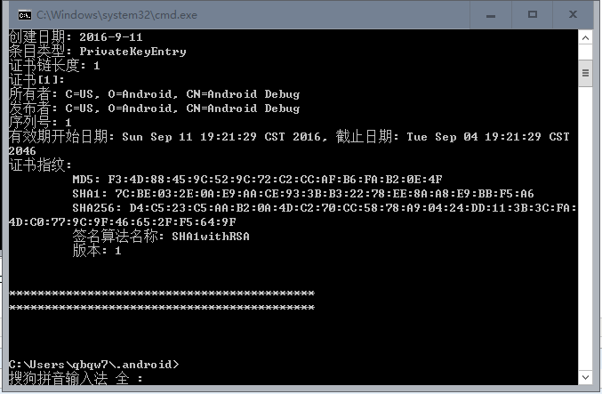 提示你输入密码,默认就是android。因为是命令窗口输入密码并不会显示输入数,输入好了回车,就可以看到我们的SHA1值了。