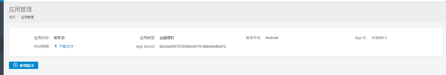 首先,你需要一个淘宝账号登陆阿里百川根据角色注册对应账号。之后申请一个App获得他的三个参数:APP ID,App Secret,RSA。这是我的个人测试账号,参数就给你们看啦。如下: