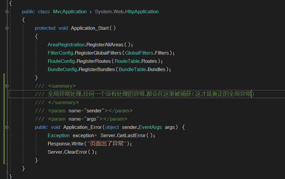 public void OnException(ExceptionContext filterContext) { string controller = filterContext.RouteData.Values["Controller"].ToString(); string action = filterContext.RouteData.Values["Action"].ToString(); filterContext.Controller.ViewData["ErrorMessage"] = filterContext.Exception.Message; //此处exception是异常类型实例 //分级:自定义不同的异常类别,完成检测,然后分级处理 if (filterContext.HttpContext.Request.IsAjaxRequest()) //如果是ajax请求,不能返回html的,要返回json异常信息 { filterContext.Result = new JsonResult() { Data=new { success=0,message="请联系管理员"} }; } filterContext.Result = new ViewResult() //返回html页面 { ViewName = "~/Views/Shared/Error.cshtml", //出错后跳转的页面 ViewData = filterContext.Controller.ViewData }; filterContext.ExceptionHandled = true; //告诉系统异常已经处理了,不用再处理了 }