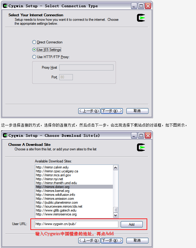 在这一步,需要注意,为了获得最快的下载速度,我们首先在列表中寻找Cygwin中国镜像的地址:http://www.cygwin.cn,如果找到就选中这个地址;如果找不到这个地址,就在下面手动输入中国镜像的地址:http://www.cygwin.cn/pub/,再点击“Add”,然后再在列表中选中。选择完成后,点击“下一步”,