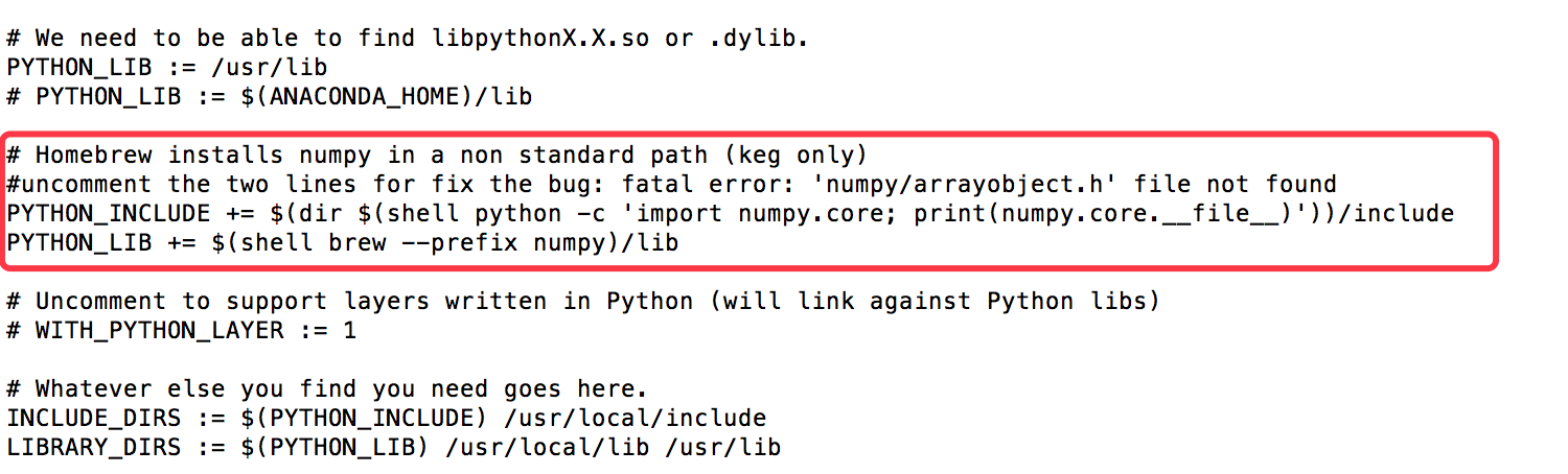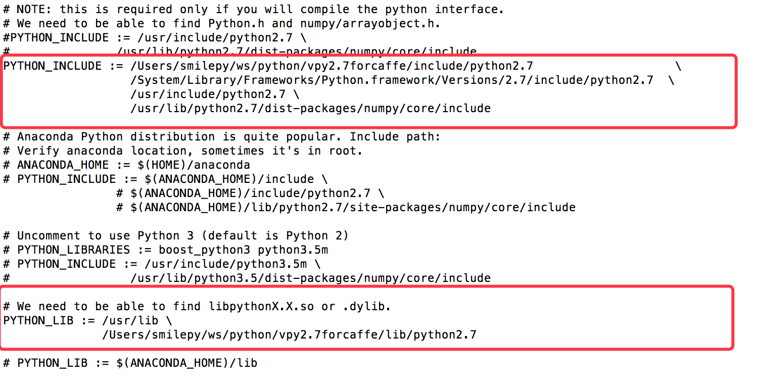 PYTHON_INCLUDE变量:将前面创建的虚拟python环境vpy2.7forcaffe中对应的include路径追加到PYTHON_INCLUDE
