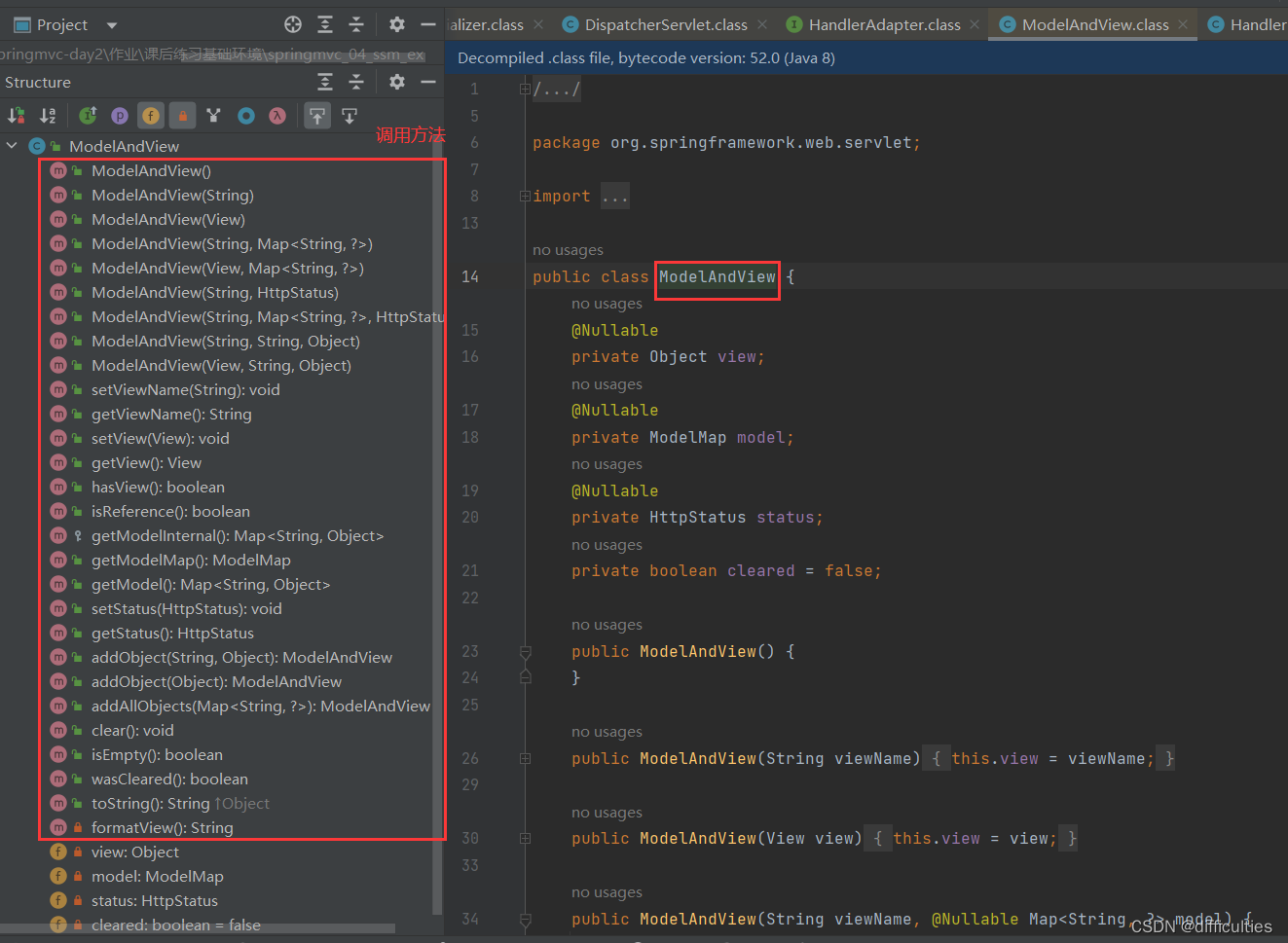 7.适配器通过调用handle方法执行处理器方法,执行完返回模型视图(ModelAndView)给前端控制器,如果使用了@ResponseBody注解标识类或方法,那么返回的ModelAndView为null,就直接响应结果给请求端(如果返需要返回JSON数据,那么底层会调用消息转换器进行JSON转换)