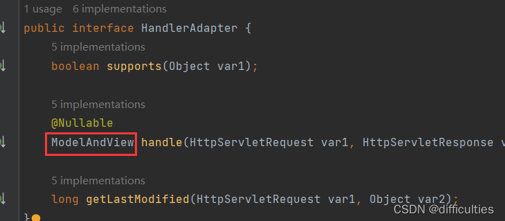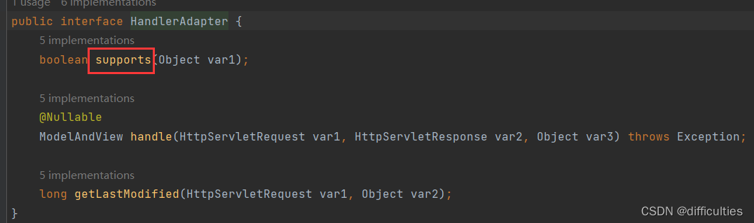 5.前端控制器通过方法getHandlerAdapter获取适配器(底层会进行适配判断,通过适配器的supports方法),通过supports方法