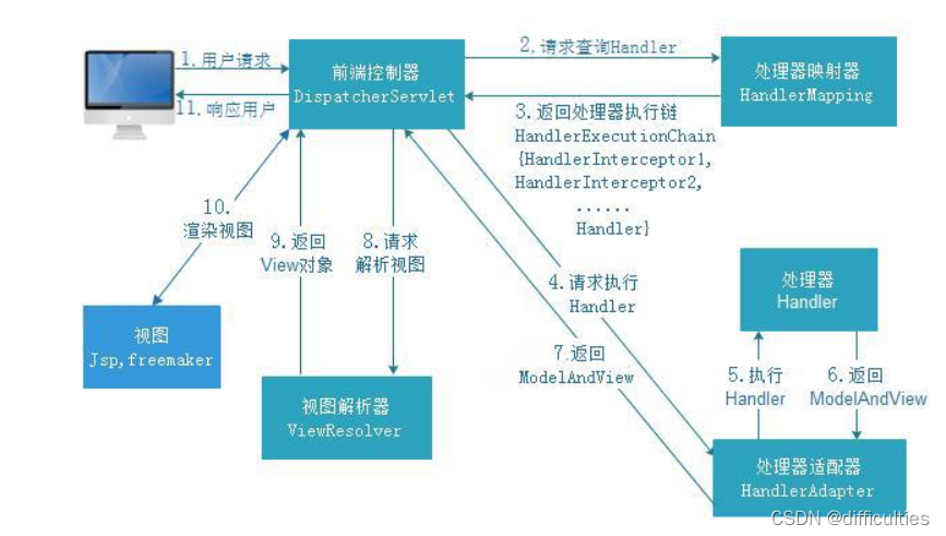 1.用户发起请求后就会到达前端控制器DispatcherServlet