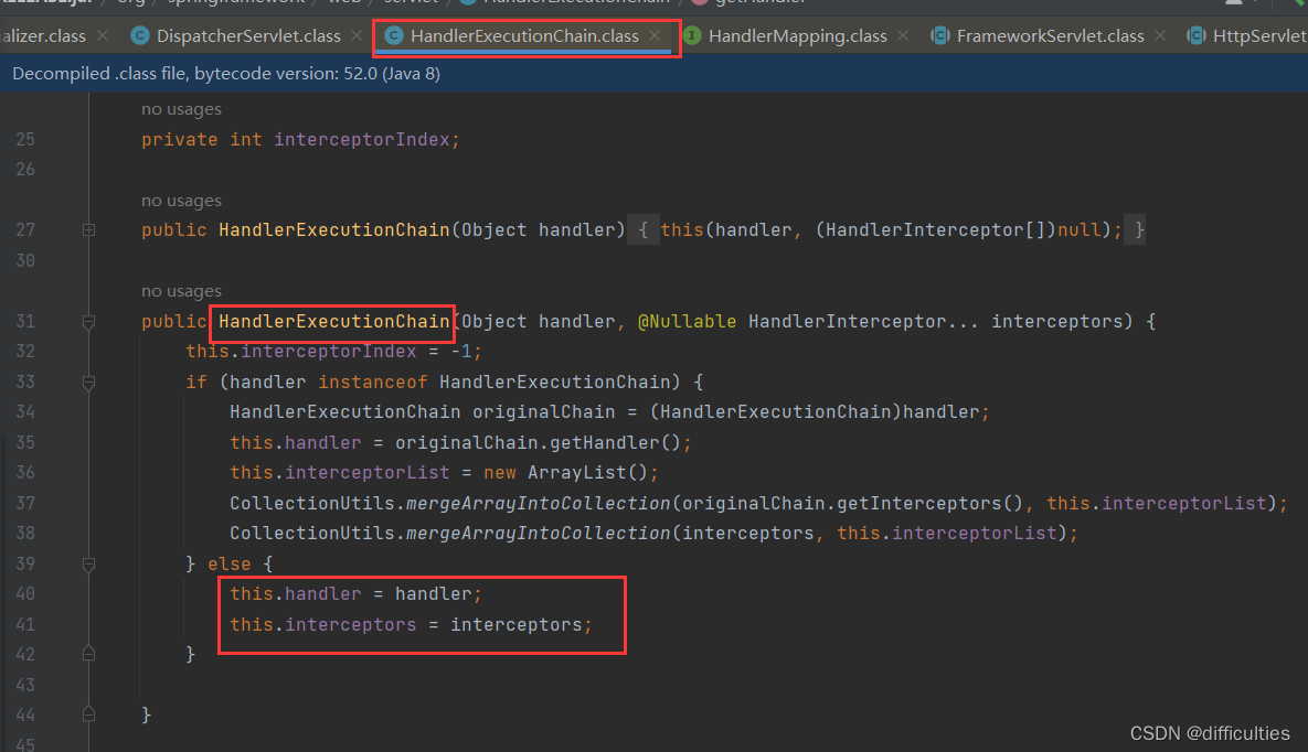 4.处理器映射器就会根据请求的URL,找到对应的Handler处理器(如果是基于注解开发,找到的就是HandlerMethod反射对象)和拦截器链,将处理器对象及拦截器链(Interceptors)一并组成处理器执行链HandlerExecutionChain返回给前端控制器