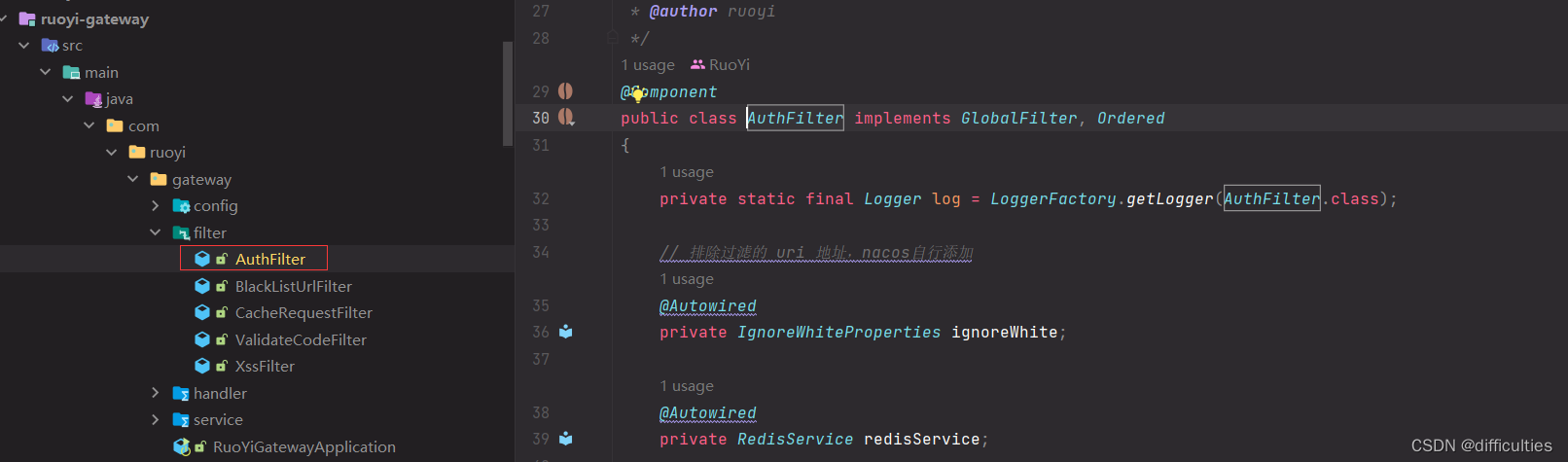首先鉴权是网关来进行处理,网关的过滤器来进行处理。经过authfilter过滤器且继承的是GlobalFilter接口