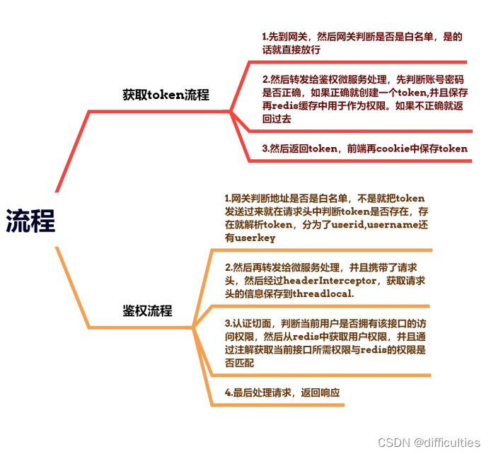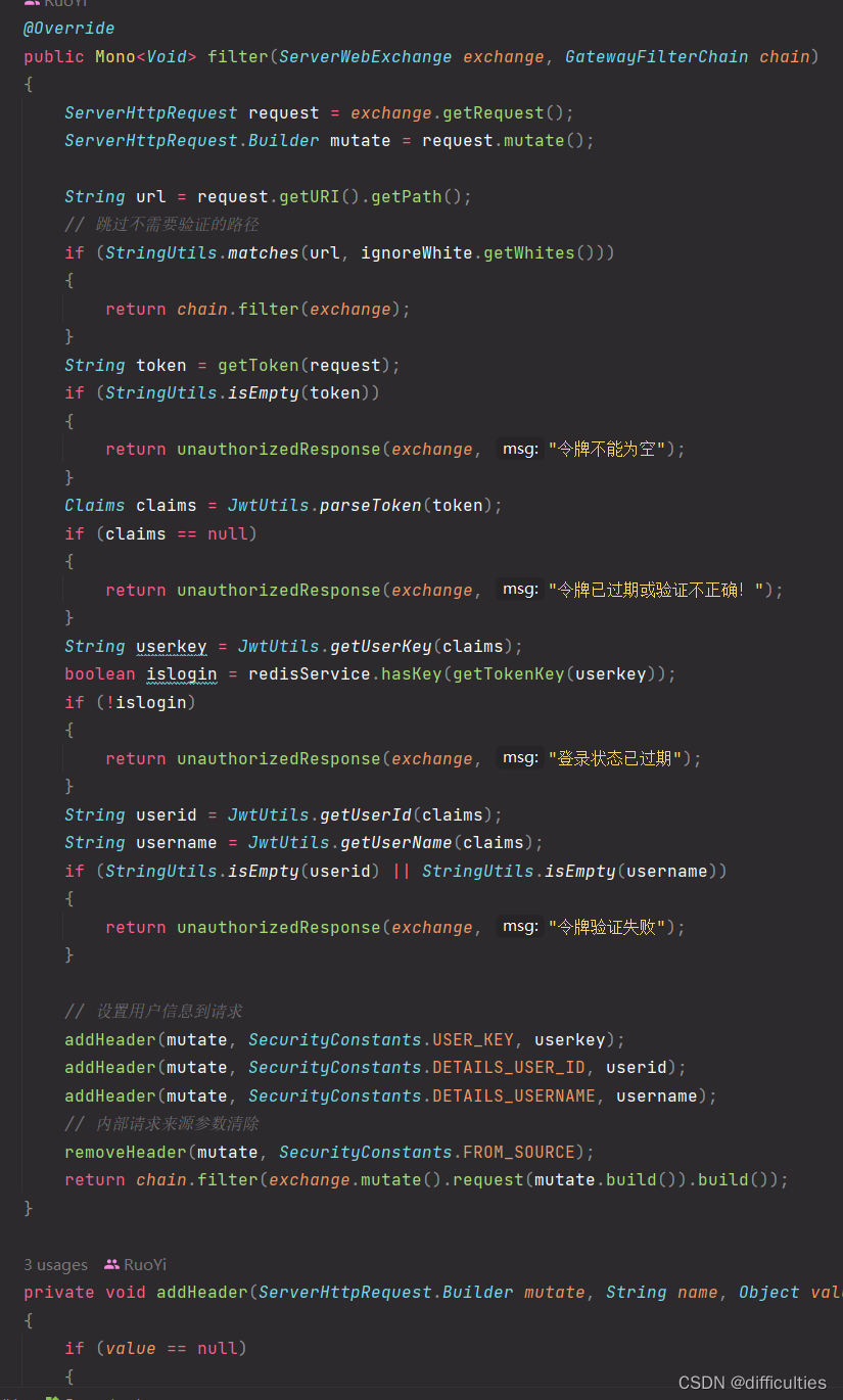 然后经过一个过滤的方法,方法使用mono,就是单体的,就是应用于观察者模式的一种编程设计。通过下面的图就是看出通过request来得到路径,然后判断是不是网关的白名单,如果是就直接放行,如果不是就判断token是不是为空,如果为空就不放行,徐娅用户惊醒权限验证。如果有token就用jwt进行解析,当解析出的token是空的话经表示令牌已经过期,然后将redis中的token数据拿出来进行判断是否为存在,不存在就说明令牌已经过期等原因。然后将userkey,useid,username添加到头去。