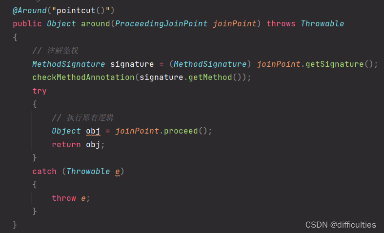 并且使用环绕通知,aop有5种通知,环绕通知结合了前面4个通知。通过注解来判断是否鉴权,然后就执行通知逻辑。