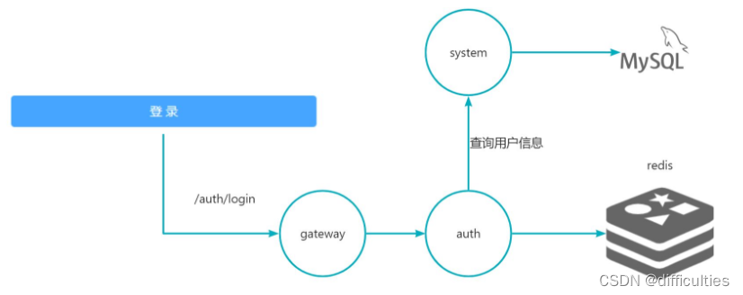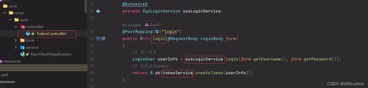 用户端发送请求,先到网关,网关识别到地址,匹配到auth,然后转发到auth服务器。在auth服务器中找到控制器,然后可以看见控制器中有一个登录的方法,里面有一个登录的方法和创建token的方法。