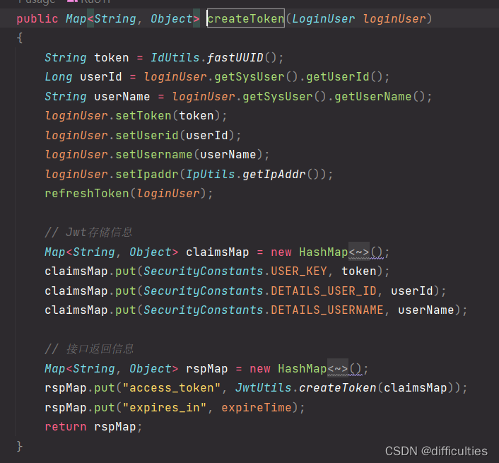 点tokenservice.createtoken方法,可以看见它分为三部分,分别是将token所携带的信息进行解析然后赋值给loginuser这个实体类中进行存取,token使用uuid来生成,userid是得到系统的用户id,username是系统的用户名字,用方法refreshtoken来进行存储,第二部分就是token使用jwt来封装token的信息,分别就是第一段的三个信息。第三部分就是将jwt的信息返回给接口。