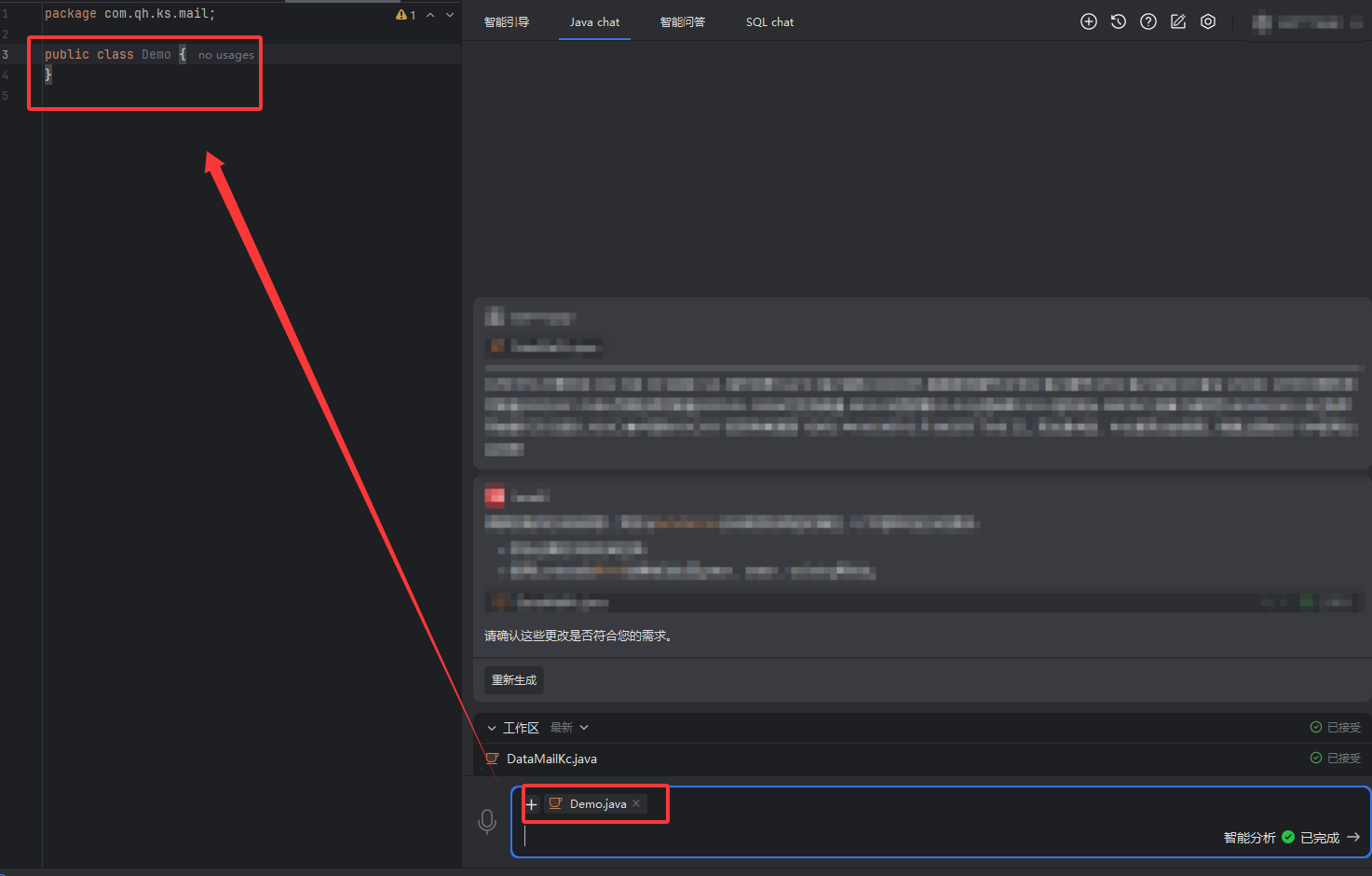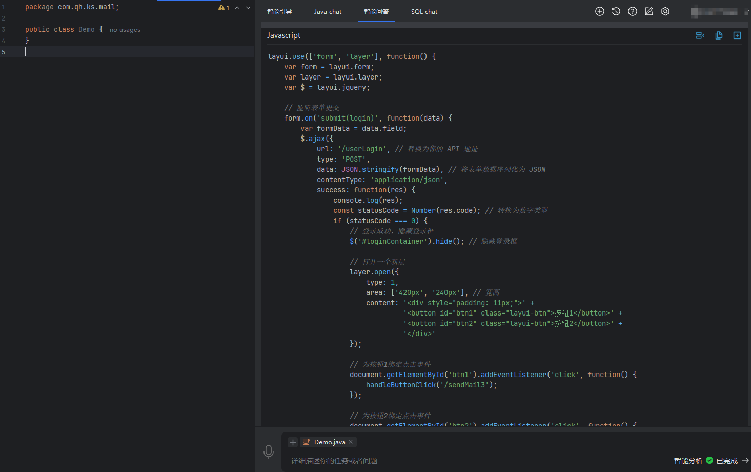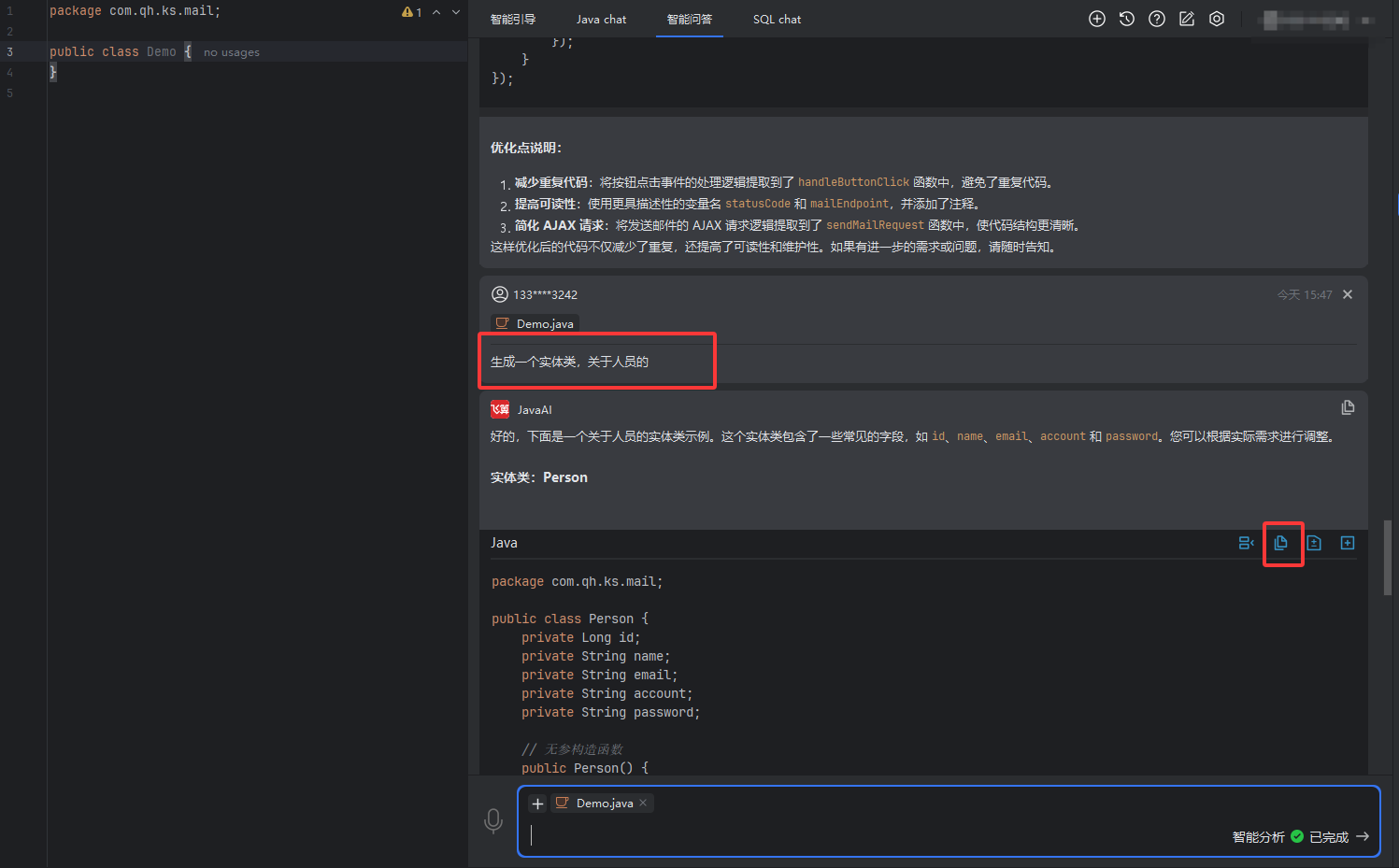 智能问答还是来生成编码的,不同与Javachat来说,Javachat是可以直接应用在类上或者方法,但是智能问答只能去复制所生成的代码
