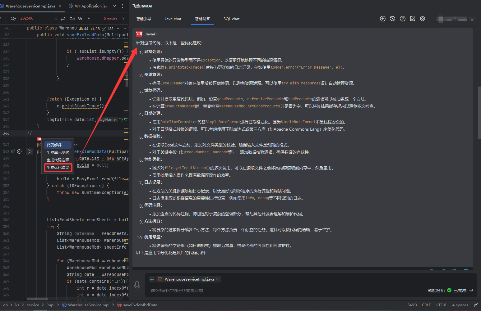 你写的每个方法上面都有一个小图标,点击小图标,就有4个选项,我觉得这个是真牛皮,主要是省了很多麻烦(其实是我懒,懒得优化等等),其实豆包还有其他AI也可以优化代码,但优化效果不是我想要的。