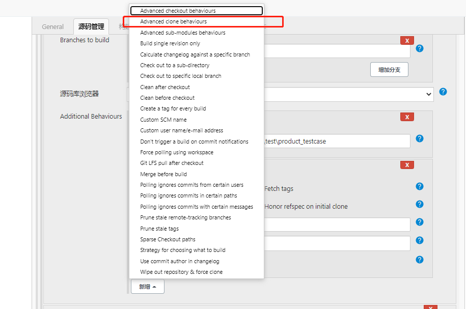 在源码管理处添加Advanced clone behaviours(如图4.1),设置合适的克隆和拉取操作的超时时间即可