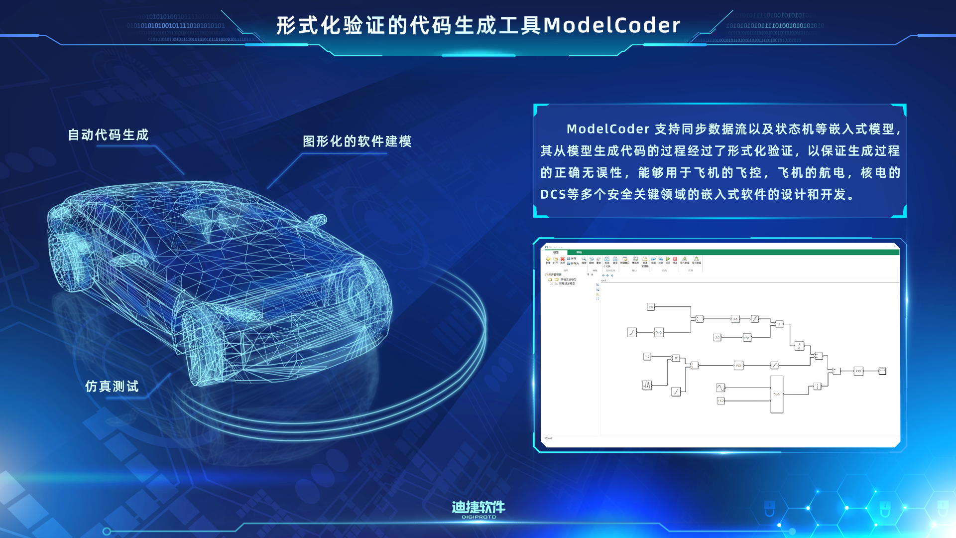 ModelCoder是浙江迪捷软件科技有限公司完全自主研发的一款支持可视化建模,仿真并生成高可靠C代码的软件设计和开发工具。ModelCoder支持同步数据流以及状态机等嵌入式模型,其从模型生成代码的过程经过了形式化验证,以保证生成过程的正确无误性,能够用于飞机的飞控,飞机的航电,核电的DCS等多个安全关键领域的嵌入式软件的设计和开发。对标产品有国外ANSYS公司的SCADE或者MathWorks公司的MATLAB/Simulink。