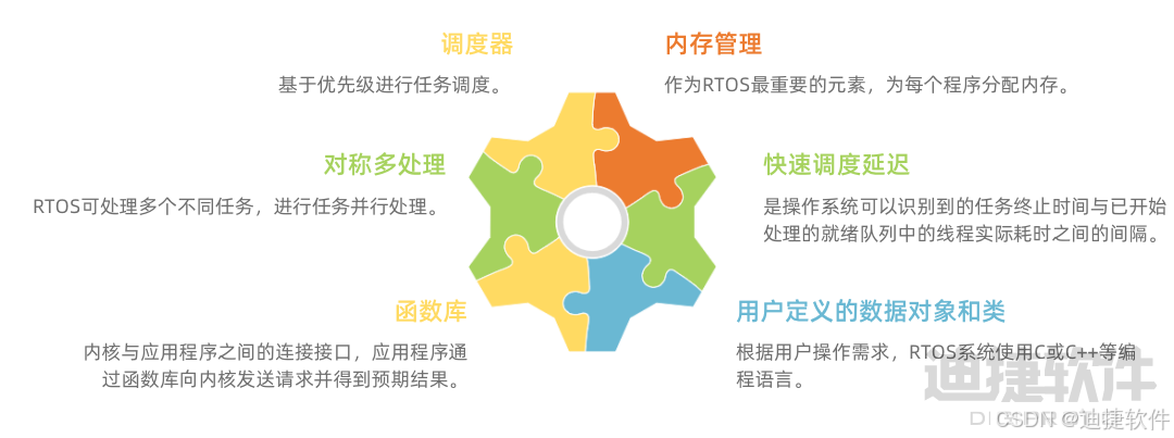 相较于通用的分时操作系统(Linux、Windows、Unix等),RTOS有着仅适用于嵌入式应用程序、基于时间片调度、抢占式内核等特点,其中断延迟可达到以微秒为单位。