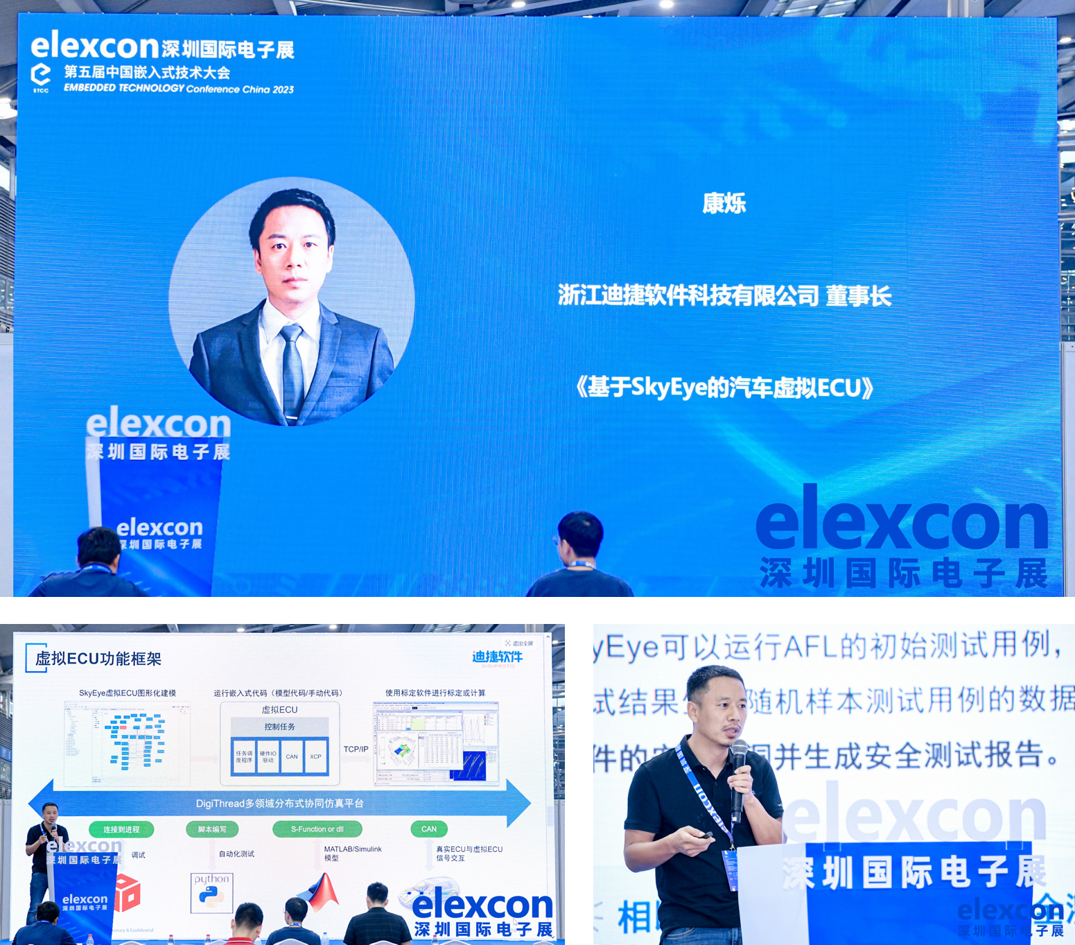 迪捷软件董事长康烁作了关于“基于SkyEye的汽车虚拟ECU”的演讲报告,报告从“嵌入式行业痛点需求、挑战和未来趋势”谈起,引入了虚拟ECU在汽车软件开发测试中的重要性,分享了当前虚拟ECU发展现状,提出基于天目全数字实时仿真软件SkyEye的虚拟ECU解决方案并进行了详细解读和案例分享(长按扫描文末二维码获取演讲资料),赢得了与会嘉宾与现场同行的一致好评与高度认可。