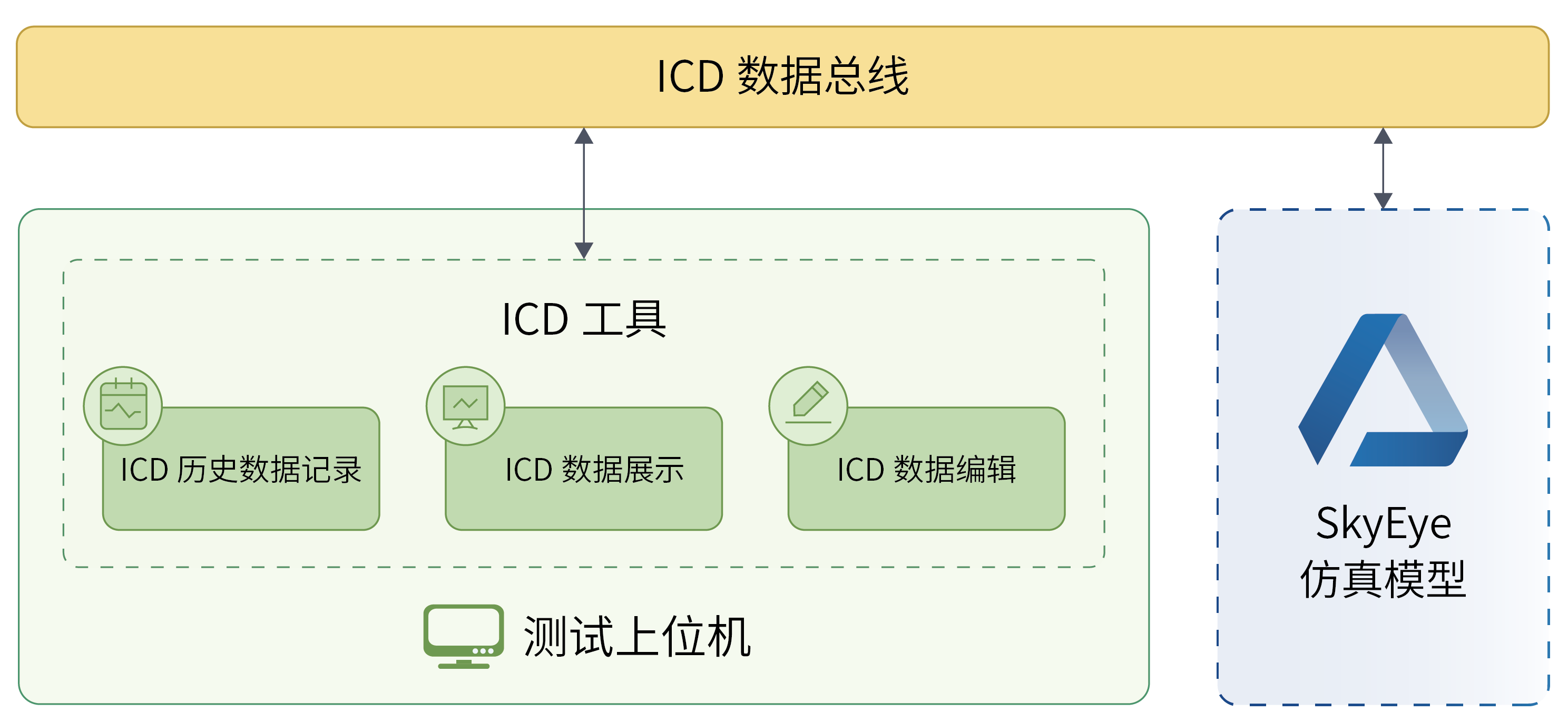 下文所示案例主要涉及集成了ICD工具的测试上位机与基于天目全数字实时仿真软件SkyEye搭建的子系统仿真模型。上位机与仿真模型通过ICD数据总线进行数据交互。在具体操作上,用户可通过自定义ICD工具报文字段的方式来测试所需验证的子系统,实现基于SkyEye的飞机各子功能针对性测试,具体如下图所示: