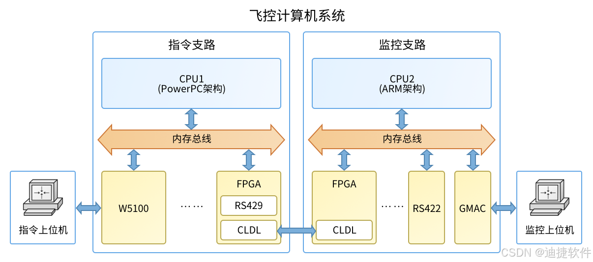 飞控计算机的设计方案中,指令和监控支路分别采用了基于PowerPC和ARM架构的处理器,其余的硬件模块则主要依赖于FPGA来实现。这两条支路共享电源、时钟和复位,以确保处理器在相同的复位和时钟信号下同步运行。