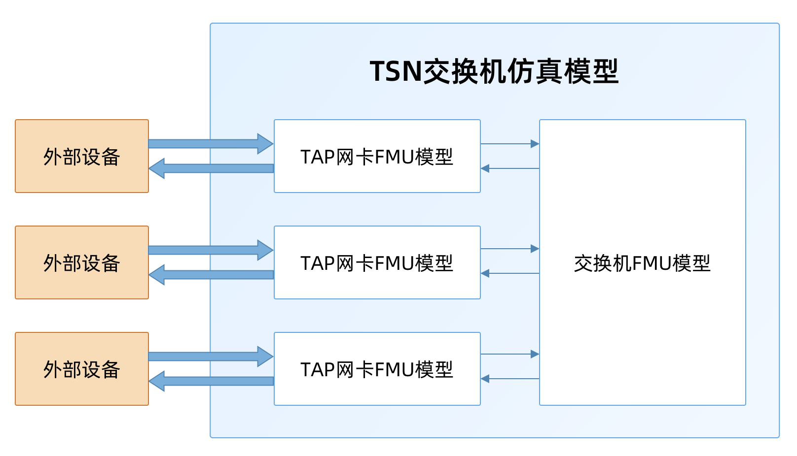 上图中,外部设备通过TAP网卡的FMU模型实现与TSN交换机仿真模型的数据包交互,交换机内部对数据包的处理则由交换机的FMU模型来完成。