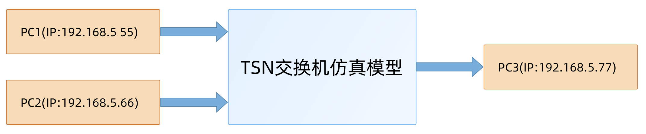 设置3台外部输入设备PC1、PC2,并设置输出设备PC3,将其IP地址分别设置为192.168.5.55、192.168.5.66、192.168.5.77。通过wireshark软件来抓取PC1、PC2发出的数据包和PC3接收的数据包,比较PC3所接收到的数据包优先级,即可确认该TSN交换机仿真模型的有效性。