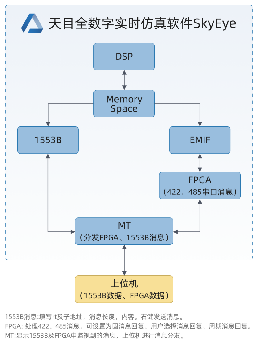 SkyEye对飞行器状态控制系统进行全硬件仿真,包括C67xx、1553B、FPGA等。上位机发送bc、rt、485、422进行消息测试,读取csv文件,并进行固定消息回复、周期消息回复。422、485消息由FPGA进行处理。用户可通过系统回复的对应消息来确认飞行器的状态。