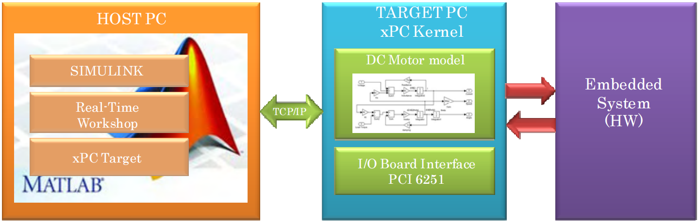 - 主机PC(HOST PC):直流电机模型由MATLAB/Simulink实现,并使用Real-Time Workshop和xPC Target编译为xPC实时内核。