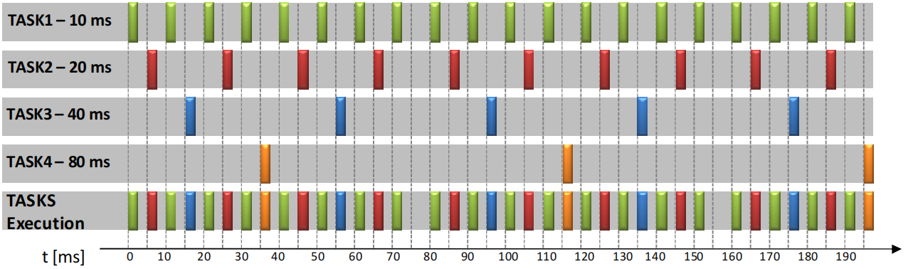 选用四个非抢占式任务:10ms、20ms、40ms和80ms。任务启动延迟及其时间调度如下图所示:
