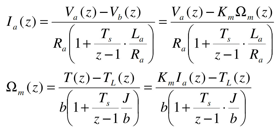 其中,Ia为电机电流,Va为电机电压,Ωm为角速度,Ra为终端电阻,La为终端电感,J为惯性,b为摩擦系数,Km为扭矩常数,Ts为采样周期,T为电机扭矩,TL为负载扭矩,Vb为反电动势电压。
