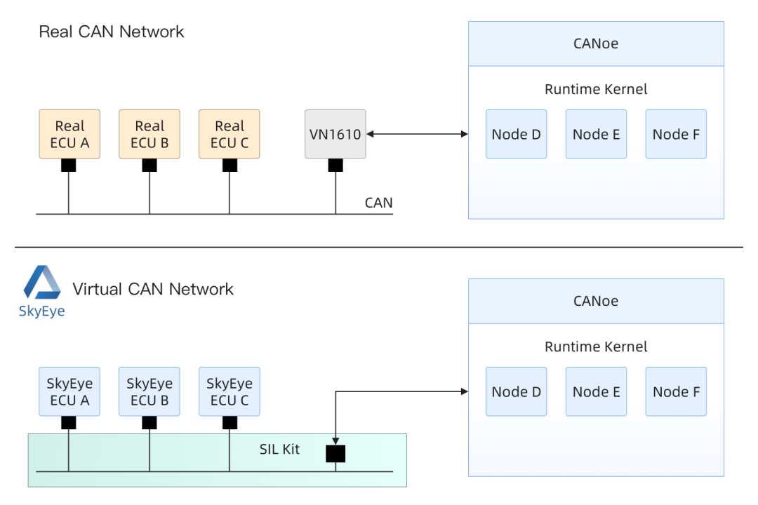 图中可以看到,在CANoe的真实使用场景中,CANoe通过CAN总线连接真实的ECU设备;虚拟设备使用场景的连接则是通过Vector SIL Kit来实现。
