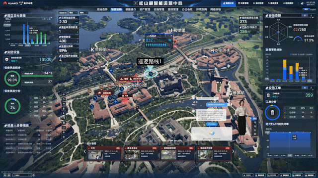 有了“数字底座”,我们开始构建上层应用。首先利用平台的 “全景监测与时空回溯” 功能,将园区整体态势进行三维立体还原。管理者可以像玩模拟城市游戏一样,自由缩放、旋转、剖切建筑,查看任意位置的实时数据。