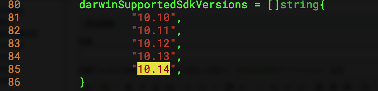 发现 SDK 为10.14,在 源码跟目录下查看 darwinSupportedSdkVersions 的定义,发现没有10.14,添加10.14即可