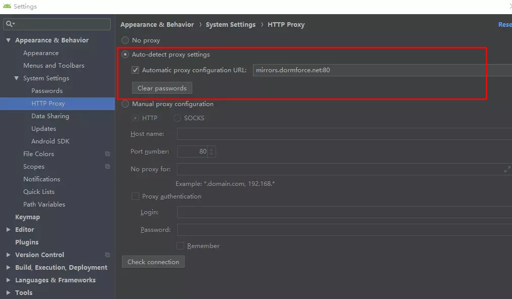 通过File=》Setting=》Appearance & Behavior =》System Settings =》Http Proxy,选择Auto-detect proxy settings,并且填写URL为:mirrors.dormforce.net:80,点击clear passwords,最后点击OK保存设置即可