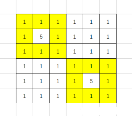2)如下图,与像素5的格子相邻的像素1的格子(0,0)、(0,1)、(0,2)、(1,0)、(1,2)、(2,0)、(2,1)、(2,2)、(3,3)、(3,4)、(3,5)、(4,3)、(4,5)、(5,3)、(5,4)、(5,5)为边界,另这些边界相邻,所以下图边界个数为1。