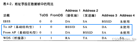其中802.11的MAC帧头的Address3比较特殊,在基础服务集内,当包发往AP时用作DA(即目的地址);当包是从AP发出时用作SA(即来源地址)。RA和TA则是分别是80211帧在无线介质中继的发送地和接收地,不一定是帧最终的处理地和一开始的产生地。如下表所示: