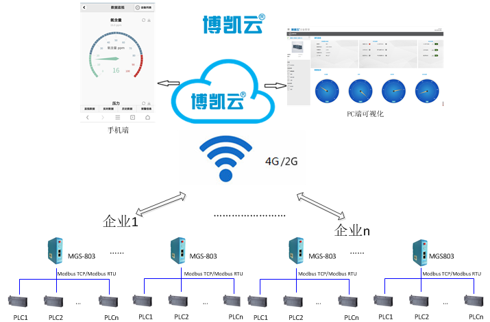 通过使用泗博物联网网关MGS-803B,对设备的PLC数据进行采集并通过4G网络发送至博云控云平台中,云平台对数据进行统一化处理、存储和分析,同时将数据发布至数据展示端(包括PC端、手机端等),企业通过各类终端对设备的状态、参数、故障信息进行监测和控制,从而达到了远程监控管理的目的。