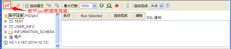 这里需要说明一下使用这种"jdbc:h2:E:/H2/gacl"这种方式连接H2数据库容易遇到的问题,如果已经在H2的WebConsole控制台中登录gacl数据库,如下图所示: