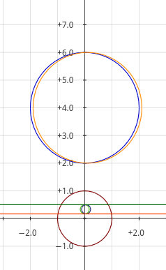 (1)对于红外公切线y=1/6,P点和小圆圆心在公切线异侧,公切线的反形(x^2+(y-3)^2=9)会内切大圆。