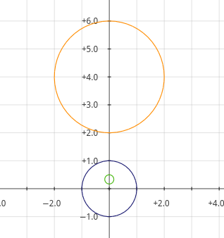 (2)对于绿外公切线y=1/2,P点和小圆圆心在公切线同侧,公切线的反形(x^2+(y-1)^2=1)会外切大圆。
