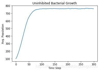 make_one_curve_plot(x_coords, y_coords, "Time Step", "Avg. Population", "Uninhibited Bacterial Growth")