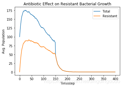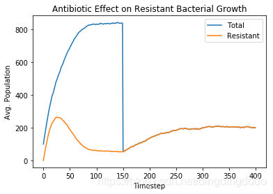 模拟没有抗生素的情况下细菌的生长情况。需要完成两个函数:simulation_without_antibiotic 以及calc_pop_avg,calc_pop_avg用来求第n个时间点的细菌平均数,simulation_without_antibiotic 用来模拟细菌的生长情况。完成代码后,运行populations = simulation_without_antibiotic(100, 1000, 0.1, 0.025, 50) 可得具体生长图像。populations 是一个二维list,用于存取每个菌落与时间相关的性质,每个list元素中的元素表示一个菌落随时间step的变化