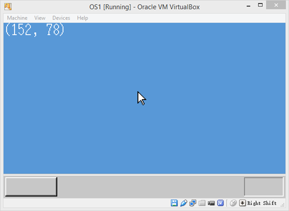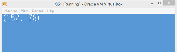 1 int mx = (binfo->scrnx - 16) / 2; //水平居中 2 int my = (binfo->scrny - 28 - 16) / 2; //排除任务栏垂直居中 3 sprintf(s, "(%d, %d)", mx, my); 4 putfonts8_asc(binfo->vram, binfo->scrnx, 0, 0, COL8_FFFFFF, s);