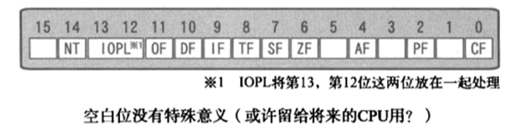 这里的0x03c9 是设备端口号, 屏蔽和恢复中断使用CLI和STI两个指令, 在naskfunc.nas里面封装成了函数io_cli(); 和 io_stl(), CLI(Clear interrupt flag) 将中断标志(interrupt flag)置零, STI(Set interrupt flag)则是将中断标志置一. 设置调色板的时候需要屏蔽中断, 但不知道当前的状态是什么, 所以在CLI之前要保存中断标志的状态. 中断标志保存在32位寄存器EFLAGS上, 由16位的FLAGS扩展而来, 下图应该是FLAGS 的示意图:中断标志位于第9位. 0 位是进位标志, 2是奇偶标志, 4 是辅助进位标志, 6是零标志, 7是符号标志, 8,10额…忘了, 11是溢出标志…使用指令PUSHFD和POPFD储存和恢复整个EFLAGS的状态, 封装为io_load_eflags()函数和io_store_eflags(eflags)函数.