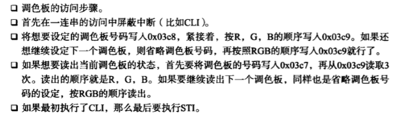 1 void set_palette(int start, int end, unsigned char *rgb) 2 { 3 int i, eflags; 4 eflags = io_load_eflags(); /*记录中断标志的值 */ 5 io_cli(); /*禁止中断 */ 6 io_out8(0x03c8, start); 7 for (i = start; i <= end; i++) 8 { 9 io_out8(0x03c9, rgb[0] / 4); 10 io_out8(0x03c9, rgb[1] / 4); 11 io_out8(0x03c9, rgb[2] / 4); 12 rgb += 3; 13 } 14 io_store_eflags(eflags); /* 恢复中断标志*/ 15 return; 16 }